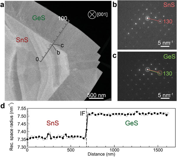 图3 多层GeS-SnS异质结构横向界面的纳米束衍射分析