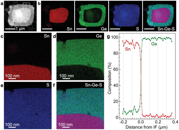 g)横向界面(IF,a中的虚线)的EDS线轮廓,显示阳离子(Sn(红色);Ge(绿色))在界面区域的分布。