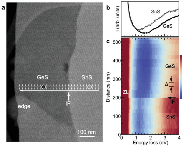 c)单色STEM-EELS光谱线扫描(空间步长Δ=20纳米),包括在多层SnS和GeS之间的横向界面上测量的全部EEL光谱(在a中的十字线点)。