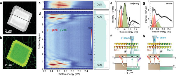 h)异质结构SnS部分的电子束激发:价带的步骤阻止了SnS空穴向GeS的转移,即发射光仅源自SnS中的辐射复合。
