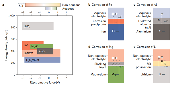 图1. 具有金属电极的各种电池化学品的能量密度和相应的腐蚀反应