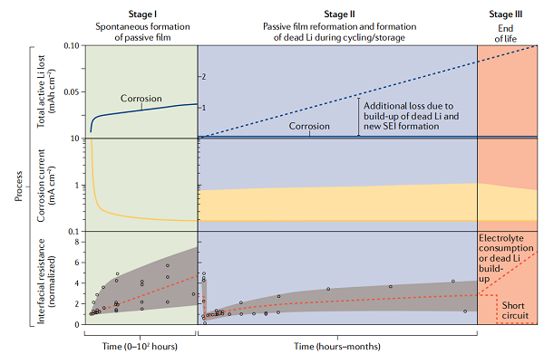 图2 非水电解质中的锂腐蚀。锂腐蚀有三个不同的阶段;第一个阶段为自发腐蚀过程;第二阶段是由于Li的剥离和电镀(包括Li-Cu界面的局部电偶腐蚀和电子转移),钝化层的改造和演变;第三阶段是电池寿命的结束,因为电化学活性锂完全消耗或短路。在这三个阶段中,原理图显示了相应的活性锂消耗总量(顶部)、腐蚀电流(中部)以及Li电极(底部)电化学界面电阻的演化