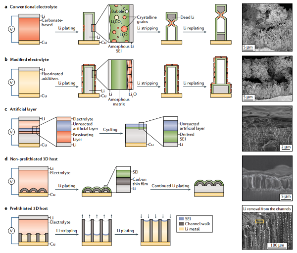 图4 自然形成的和人造的固体界面。在连续的锂剥离和电镀时,界面会影响锂的形态和结构