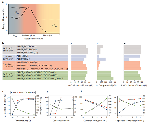 图5 影响界面和界面相演变的因素。a) Li+在电解质传输的能量图;b-e) 电解液组成、改性集流器(包括外加电流密度和循环容量)以及相应的首圈库仑效率(CE);f-e) 温度的影响