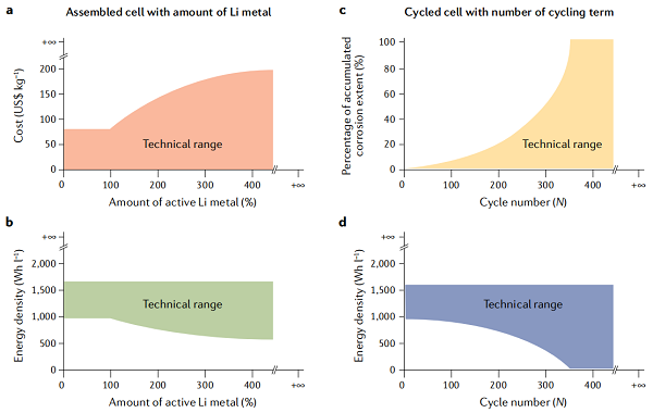 图6 锂金属电池商业化应用的相关参数。a) 锂金属负极的总成本;锂金属全电池的初始能量密度;c) 根据循环性能和残余锂量确定从组装开始直至电池失效的累积腐蚀锂量的百分比;d) 能量密度随循环次数的变化过程