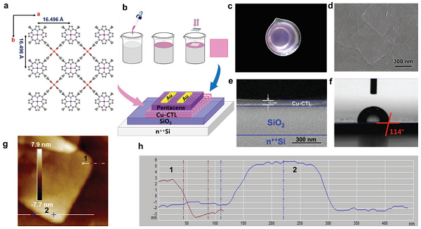 图2 Cu-CTL二维MOF结构示意图、基于Cu-CTL纳米片的OFET存储器件及Cu-CTL纳米片薄膜表征