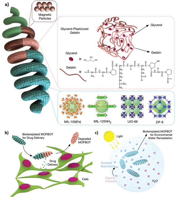 生物模板是制造小型设备的一种强大方法。苏黎世联邦理工学院Salvador Pané等人报道了金属有机骨架(MOF)纳米晶体在螺旋藻生物模板磁螺旋结构上的组装。结果表明,该方法具有通用性,可用于不同功能的生物模板结构的MOF系统配置。MOF纳米晶体在磁性涂层螺旋生物模板上的成功组装是通过用明胶装饰磁性表面实现的,明胶是一种天然的大分子,其合成链可以通过静电作用锚定MOF纳米晶体。此外,由于明胶是一种热响应材料,它可以从MOF纳米晶体货物中释放磁性生物模板。因此,该系统可以作为具有多种功能的高集成磁驱动微型机器人使用。为此,这些复合螺旋结构的潜力被证明是基于MOF的小型机器人,应用于生物医学和环境修复。相关研究以“Biotemplating of Metal–Organic Framework Nanocrystals for Applications in Small-Scale Robotics”为题目,发表在AFM上。DOI: 10.1002/adfm.202107421