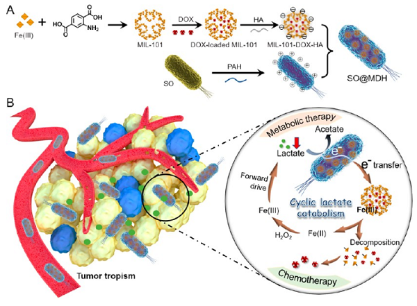 肿瘤微环境中过量的乳酸常导致化疗效果不佳。在此,武汉大学陈巍海、张先正等人构建了一种SO@MDH自驱动生物反应器,通过将集成装载了化疗药物DOX的MOF材料MIL-101纳米颗粒/透明质酸(MDH)与SO集成,可达到敏化化疗的目的。由于SO自身的向瘤性和电子驱动呼吸作用,生物杂化SO@MDH可以主动靶向和定殖缺氧和富营养化肿瘤区域,并在将电子转移到Fe3+的同时厌氧代谢乳酸,这是MIL-101纳米颗粒的关键成分。因此,瘤内乳酸会持续分解代谢,同时Fe3+还原为Fe2+, MIL-101框架降解,从而加速药物释放,实现有效化疗。同时,产生的Fe2+会被肿瘤微环境中丰富的过氧化氢迅速氧化,生成Fe3+,进而有利于循环分解乳酸,促进化疗。更重要的是,瘤内摄入乳酸可显著抑制多药耐药相关ABCB1蛋白(又称p-糖蛋白(P-gp))的表达,从而征服耐药肿瘤。SO@MDH具有较高的肿瘤特异性,在抑制肿瘤生长、克服多药、耐药方面具有良好的化疗效果,证实了其在肿瘤治疗中的潜在前景。相关研究以“A Self-Driven Bioreactor Based on Bacterium−Metal−Organic Framework Biohybrids for Boosting Chemotherapy via Cyclic Lactate Catabolism”为题目,发表在ACS Nano上。DOI: 10.1021/acsnano.1c06123