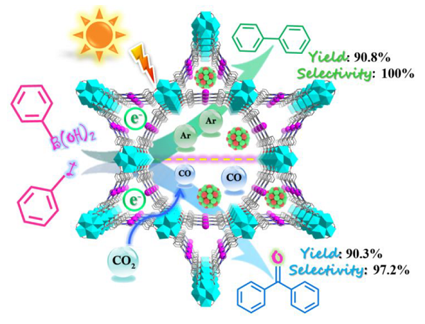 太阳能驱动的CO2羰基化取代有毒的CO作为C1来源是相当有趣的;然而,由于CO2分子的惰性,这仍然是一个巨大的挑战。在此,天津理工大学张志明、郭颂等人将钴单位点和超细CuPd纳米簇催化剂整合到卟啉基金属-有机框架中,构建复合光催化剂(Cu1Pd2)z@PCN-222(Co) (z = 1.3、2.0和3.0 nm)。在可见光照射下,激发的卟啉可以同时将电子转移到Co单位点和CuPd纳米团簇上,为CO2光还原和Suzuki/Sonogashira反应的耦合提供了可能。(Cu1Pd2)1.3@PCN-222(Co)的多组分协同不仅可以替代危险的CO气体,而且可以显著促进二苯甲酮在CO2中的光合作用,在温和条件下收率超过90%,选择性达97%。系统研究清楚地揭示了这些复合催化剂中不同组分的功能和协作,突出了利用温室气体CO2作为C1源开发可持续羰基化反应方案的新视角。相关研究以“Feeding Carbonylation with CO2 via the Synergy of Single-Site/Nanocluster Catalysts in a Photosensitizing MOF”为题目,发表在JACS上。DOI: 10.1021/jacs.1c08908
