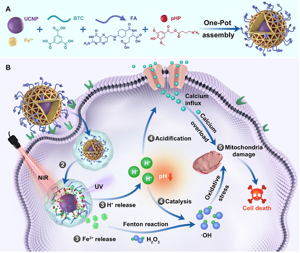 以亚细胞细胞器为靶点进行多级损伤的抗肿瘤治疗已显示出很大的前景。在此,中科院过程工程研究所Guanghui Ma、Wei Wei 及Zhiyuan Tian等人报道了一种核-壳型纳米试剂,该试剂以铁(III)羧酸金属-有机骨架(MOFs)为壳,上转化纳米颗粒(UCNPs)为核,近红外(NIR)光触发协同增强线粒体的氧化应激和钙超载。MOFs外壳上的叶酸修饰使纳米制剂的细胞吸收效率更高。基于UCNPs的上转换能力,近红外光介导Fe3+还原为Fe2+,同时激活光酸发生器(pHP)包埋在MOFs腔内,使游离Fe2+释放和细胞内微环境酸化。过氧化氢在线粒体中过表达、高活性Fe2+和酸性环境协同强化Fenton反应,产生致命的羟基自由基(•OH),而血浆光酸化诱导钙内流,导致线粒体钙超载。纳米制剂基于双线粒体损伤的治疗能力已在体内细胞和患者源性肿瘤移植模型中明确证实。相关研究以“MOFs-based nanoagent enables dual mitochondrial damage in synergistic antitumor therapy via oxidative stress and calcium overload”为题目,发表在Nature Commun.上。DOI: 10.1038/s41467-021-26655-4