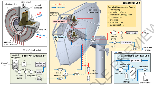 航空和航运业目前约占人类活动总量的8%二氧化碳排放,加上旅游业和全球贸易的增长,预计将使这一贡献进一步增加。使用可充电电池驱动的电动机进行碳中和运输是可行的,但对于长途商业旅行,尤其是航空旅行来说,即使是可能的,也是一种挑战。一个很有前途的解决方案是利用太阳能驱动的过程,从H2O和CO2中提取液体烃燃料(如煤油、汽油或柴油等石油衍生的液态烃燃料的合成替代品)。在许多可能的方法中,利用集中的太阳辐射作为高温过程热量来源的热化学途径具有潜在的高生产速率和效率,并且如果直接从大气空气中获得所需的二氧化碳,可以提供真正的碳中性燃料。如果水也可以从空气中共同提取,那么原料采购和燃料生产就可以同时设在太阳能辐射高和水资源有限的沙漠地区。瑞士苏黎世联邦理工学院的Aldo Steinfeld、Philipp Furler等人报道了用阳光和空气生产燃料,同时实施了该计划的各个步骤,演示了整个热化学太阳能燃料生产链的运行,从直接从环境空气中捕获的H2O和CO2到运输燃料(如甲醇、煤油)的合成,采用模块化的5千瓦中试规模太阳能系统在实际现场条件下运行,并将进一步确定研发工作,并讨论将这些太阳能燃料推向市场所需的经济可行性和政策。相关研究以“Drop-in Fuels from Sunlight and Air”为题目,发表在Nature上。DOI: 10.1038/s41586-021-04174-y