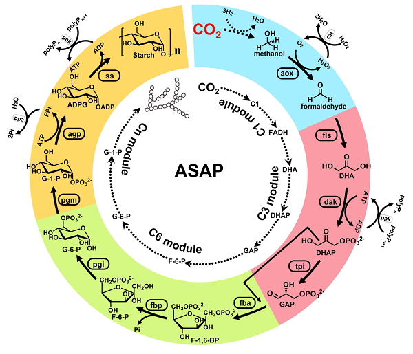 淀粉是碳水化合物的一种储存形式,是人类饮食中热量的主要来源,也是生物工业的主要原料。中科院天津工业生物技术研究所马延和等人报道了在无细胞系统中由二氧化碳(CO2)和氢气合成淀粉的化学-生化杂交途径。人工淀粉合成代谢途径(ASAP)由11个核心反应组成,通过计算途径设计,通过模块化组装和替代建立,并通过三种瓶颈相关酶的蛋白质工程优化。在一个具有空间和时间分离的化酶系统中,在氢的驱动下,ASAP将二氧化碳转化为淀粉的速率为每分钟22纳米摩尔的二氧化碳每毫克,是玉米淀粉合成速率的8.5倍。这种方法为未来利用二氧化碳合成化学生物杂化淀粉开辟了道路。相关研究以“Cell-free chemoenzymatic starch synthesis from carbon dioxide”为题目,发表在Science上。