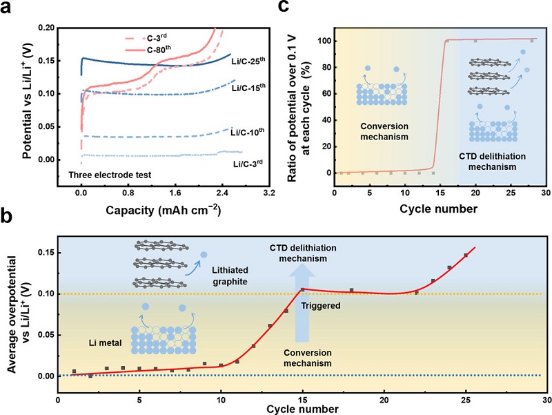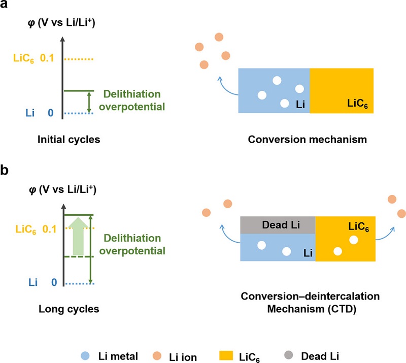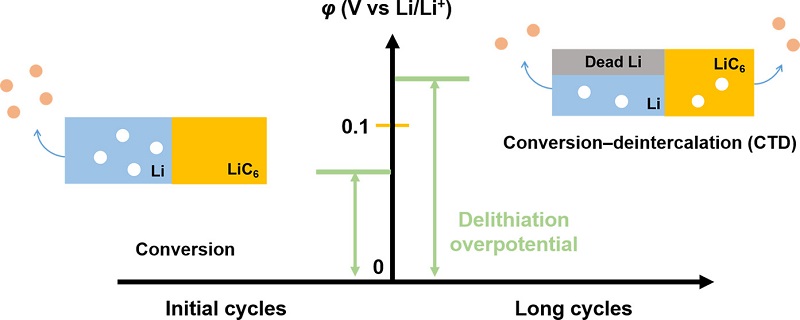 在各种负极材料中,基于转化机制的锂金属提供了3860 mAh g-1的超高理论比容量和低还原电位(-3.040 V vs. RHE),被认为是理想的电池负极材料。但是由于不均匀的脱出过程,部分活性锂不可避免地失去与导电网络的电子接触,形成“死锂”。在后续循环中,死锂不能被利用,降低了锂金属的利用效率,从而导致工作电池的寿命缩短。但是在死锂累积过程中,金属锂负极的脱锂电位逐步提升,为复合脱锂机制的设计提供了机会。石墨负极基于脱嵌机制的脱锂电位是0.1 V vs. Li/Li+,比金属锂的脱锂电位(0 V)稍高。而石墨负极循环过程中库仑效率极高,不易产生死锂。因此,可以通过复合负极的构筑实现脱锂机制的转变,有望在保证比容量的前提下,在后期循环中实现新的脱锂机制,减少在循环过程中产生的死锂,提升负极循环稳定性。
