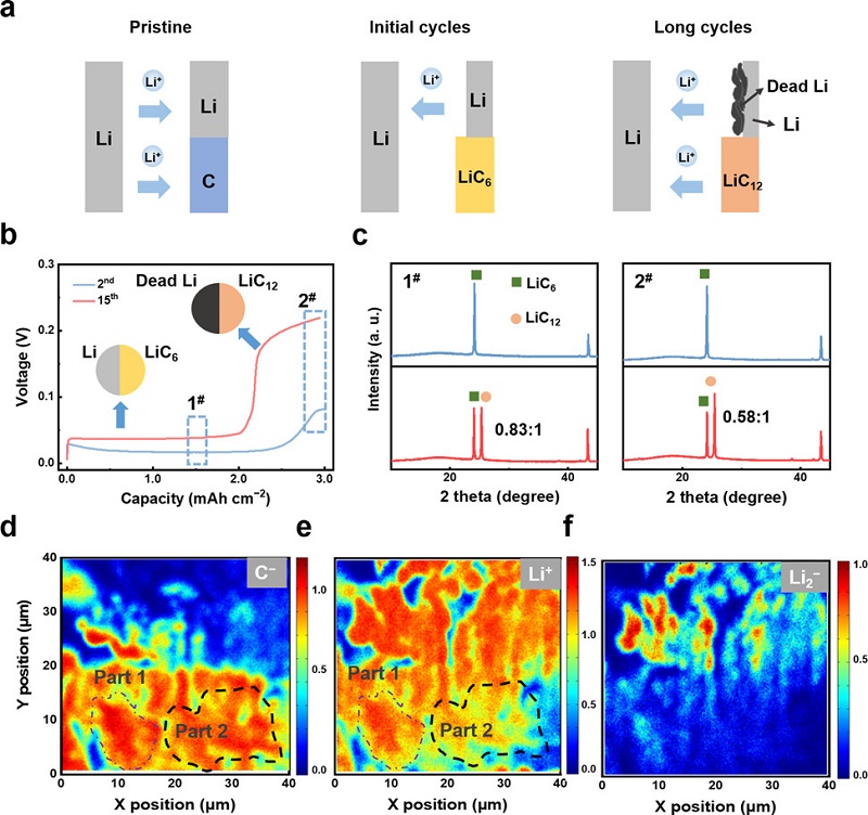 (d-f)TOF-SIMS分析第15次循环后的图3b中的半圆形石墨电极中的(d) C−、(e) Li+和(f) Li2−。