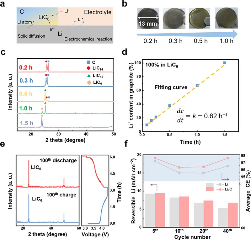 (f)在不同循环下普通锂和Li/C复合负极的平均CE和可逆锂容量。