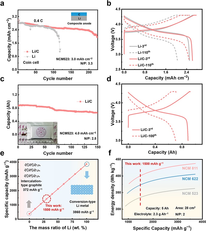 (c)具有Li/C负极和NCM523正极的1 Ah软包电池在0.1 C下的循环性能;