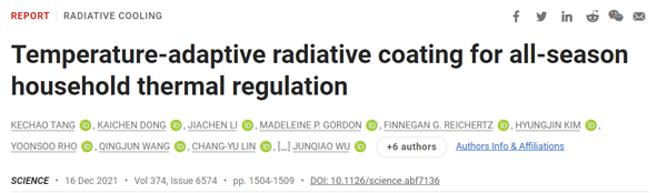 文献链接:Temperature-adaptive radiative coating for all-season household thermal regulation(Science,2021,DOI:10.1126/science.abf7136)