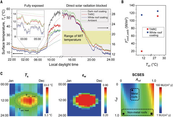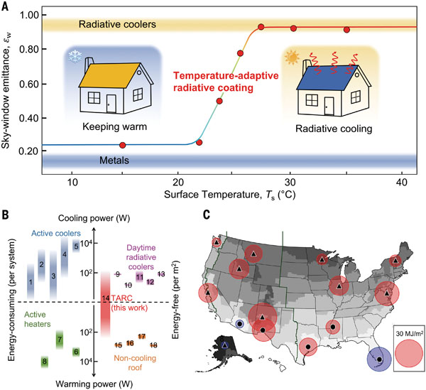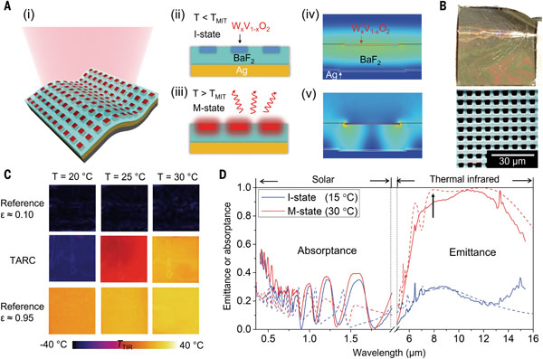 今日,在加州大学伯克利分校吴军桥教授团队等人带领下,通过开发一种从四季的角度来进行热调节的机械柔性涂层,使其热发射率适应不同的环境温度。制备的温度适应性辐射涂层(TARC)在光子放大的金属-绝缘体转变的驱动下,以最佳方式吸收了太阳能,并自动将热发射率从环境温度低于15℃时的0.20切换到温度高于30℃时的0.90。模拟结果显示,在大多数气候条件下,特别是在季节性变化较大的气候条件下,该系统的节能效果优于现有的屋顶涂料。相关成果以题为“Temperature-adaptive radiative coating for all-season household thermal regulation”发表在了Science。