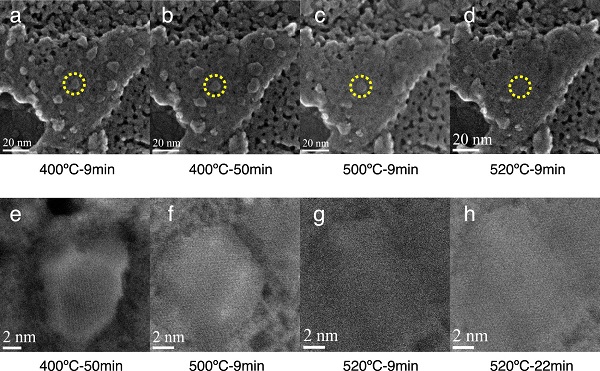 不同预处理温度下H2/N2比为3:1时Ni粒子在γ-Mo2N载体上的演化,其中a-d为大范围SE/STEM图像,e-g为对应选区中的高分辨图像。