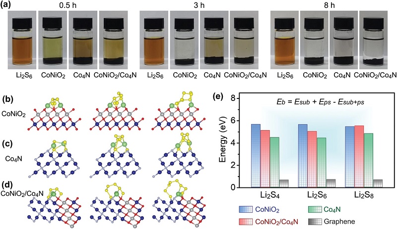 (b-d)Li2S6在不同基材上的优化几何结构:CoNiO2(200)表面、Co4N(111)表面和相应的CoNiO2/Co4N异质结界面;