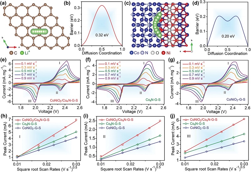 (a-d)锂离子迁移路径和相应屏障的说明:石墨烯和CoNiO2/Co4N异质结构;