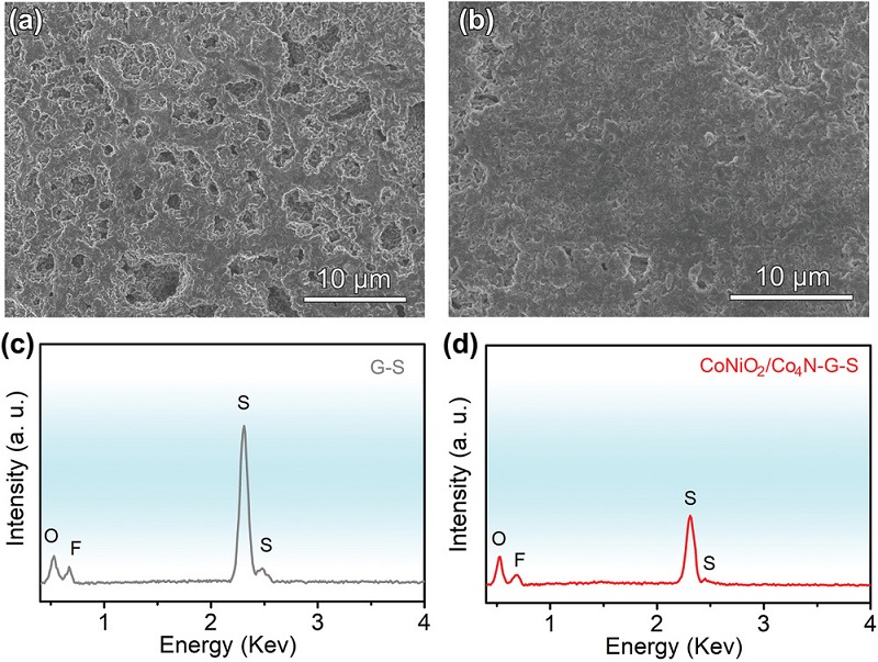 (c-d)G-S和CoNiO2/Co4N-G-S的相应EDS结果。