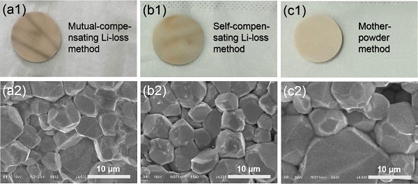 在MCLL方法中,多片叠加的LLZO素坯中过量的Li2O(s)在高温下升华能为烧结系统中提供充足的Li2O气体,并且在系统内积累。随着Li2O气体的蒸汽压逐渐升高,Li2O气体凝聚在LLZO颗粒间的颈部(凹曲面处蒸气压较低),使颗粒间的接触面积增加、系统的表面能降低,从而加速物质传递、促进陶瓷致密化和晶粒生长。从宏观上来看,这就产生了陶瓷片间相互促进烧结、互相补偿锂损失的现象。