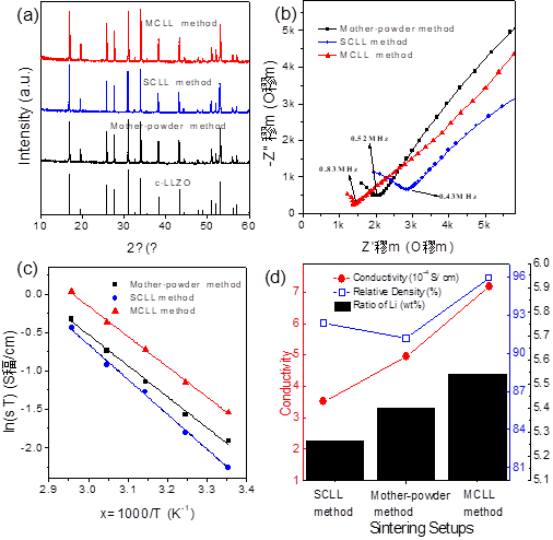 (a)XRD图谱,(b)归一化EIS曲线,(c)总电导率的阿伦尼乌斯图,(d)室温总电导率、致密度和Li含量(wt %)