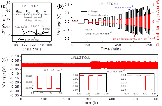 (a)Li/LLZTO/Li对称电池的EIS曲线(电阻值归一化为面电阻,插图为等效电路图),(b)极限电流密度测试和(c)对称电池在室温下的长期恒电流循环性能