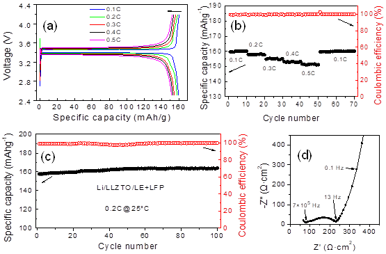 将用MCLL法制备的LLZTO应用于LiFePO4正极的锂金属固态电池:(a)不同倍率下的充放电电压曲线,(b)倍率能力,(c)0.2 C下的循环性能,(d)室温下Li/LLZTO/LE+LFP固态电池的EIS曲线