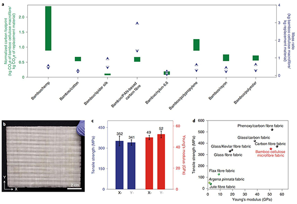 (a)竹纤维束与不同纤维材料(大麻、棉花、蜘蛛丝、PAN基碳纤维、尼龙-6,6、聚丙烯、人造丝、聚酯纤维)碳足迹比较;
