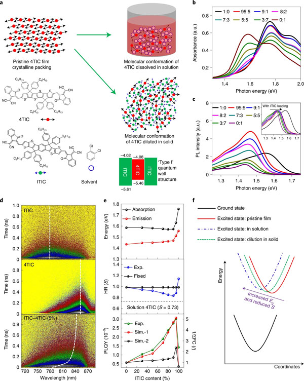 e、4TIC-ITIC混合薄膜随成分变化的最大发射/吸收峰值能量(稳定)、HR参数和PL量子产率。