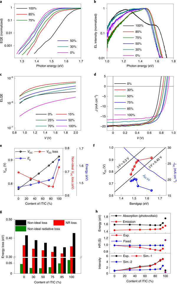 g)不同ITIC含量的PBDB-T-4TIC的VOC损失分析和电荷传输性能:非理想VOC损失(黑色)、非辐射VOC损失(红色)和非理想辐射VOC损失(绿色)。