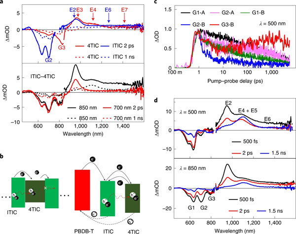 a)4TIC、ITIC和ITIC-4TIC混合物的原始薄膜的光诱导吸收(OD)光谱。混合薄膜在850 nm(黑色)和700 nm(红色)处被激发。
