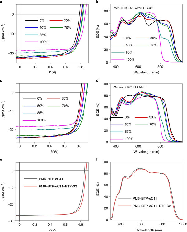 e、f)PM6-BTP-eC11在加入或不加入BTP-S2稀释剂时的J-V曲线(e)和EQE谱(f)。