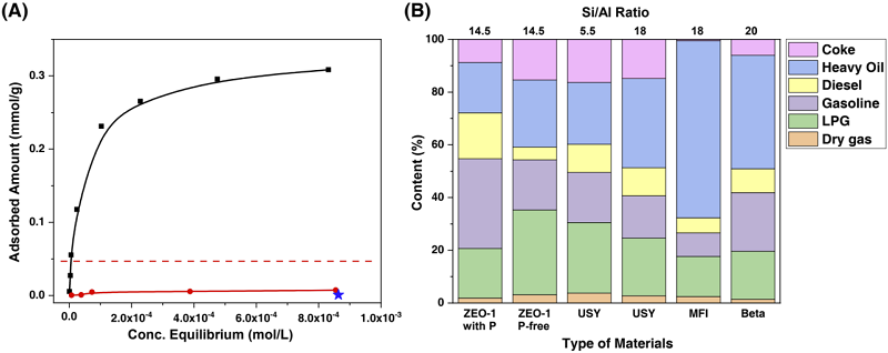 图3. ZEO-1的超大孔道吸附与催化:(A)尼罗红吸附曲线(黑色:ZEO-1,红色:USY,蓝色五星为未煅烧的ZEO-1);(B)ZEO-1与典型工业沸石催化剂的重油催化裂化性能对比(来源:Science)
