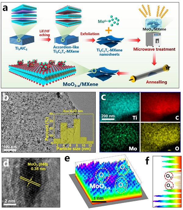图2. MoO3-x/MXene的结构表征及电子结构DFT计算