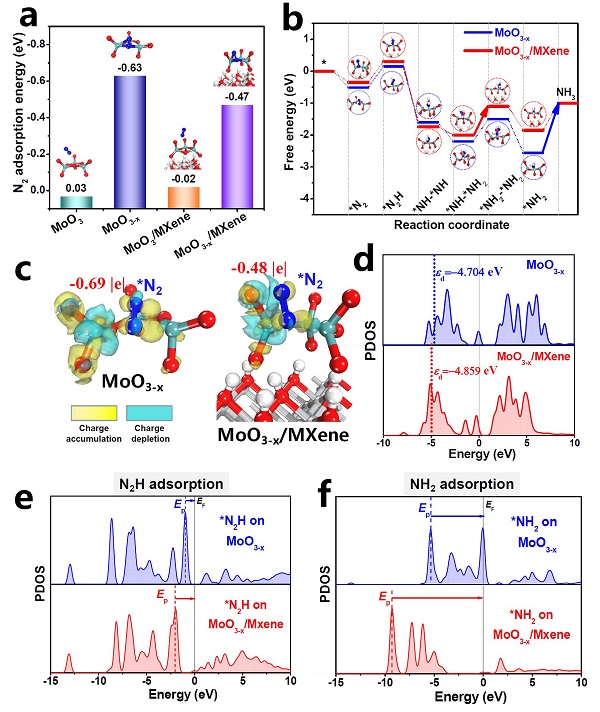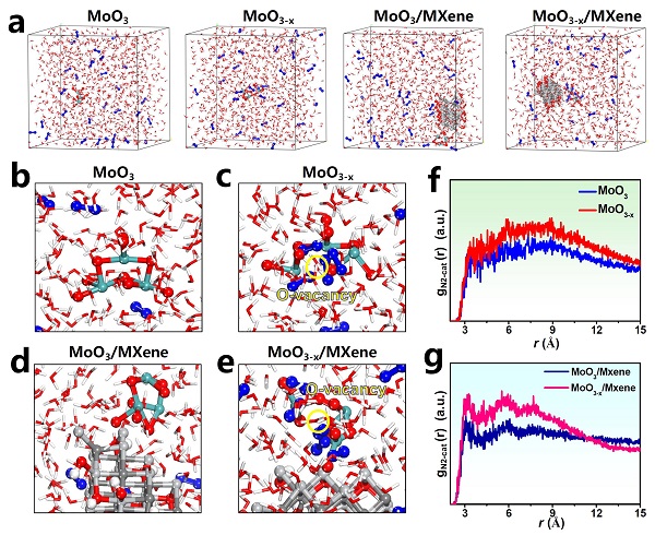 要点二:原位拉曼光谱,分子动力学模拟和DFT计算表明,MoO3-x/MXene中的氧空位为NRR活性中心,可有效吸附和活化N2分子,且降低第一加氢步骤的能垒,但氧空位对中间体的吸附过强,不利于NH3的脱附。
