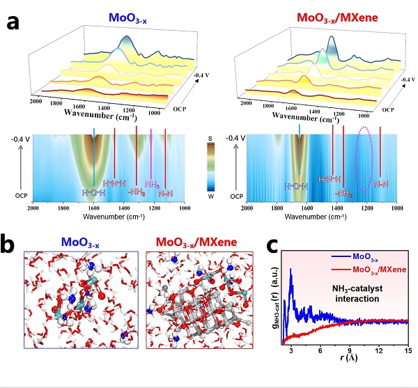 要点三:原位红外光谱和分子动力学模拟表明,MXene和MoO3-x的异质结协同作用可进一步优化氧空位的电子结构,打破比例关系,降低氧空位对中间体的吸附强度,从而利于NH3的脱附,加速加氢反应循环。