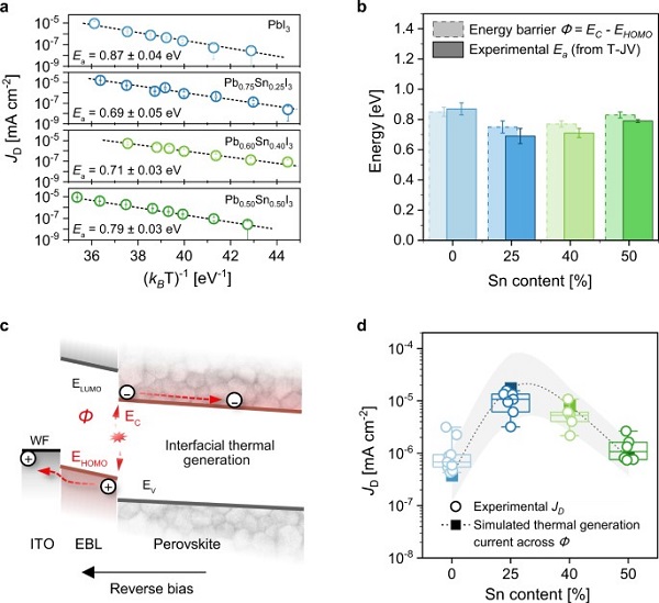 (d)在相同的电子阻挡层和Pb:Sn组合时,实验暗电流密度(V=-0.5 V,室温)与Φ的关系。
