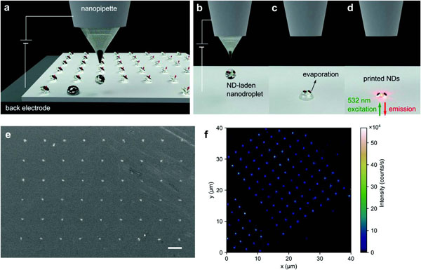 金刚石晶体中的点缺陷,如氮空穴(NV)中心和其他新兴的IV族缺陷,如硅空穴中心(SiVs),已经成为量子信息处理、量子计算、量子光学和量子传感的动力源。作为最公认的金刚石缺陷之一,NV中心在室温下显示出其独特的量子特性和稳健性,为量子技术的实现提供了一条可行的途径。特别是,NV中心可以承载在纳米级的金刚石颗粒(纳米金刚石)中,作为多功能纳米剂,在不同的领域有许多应用的机会。例如,NV中心的纳米金刚石已经证明了其作为磁测和测温的纳米尺度探针的能力,以及作为生物体内跟踪动态生物过程的生物标记物的能力。由于量子系统的“脆弱性”,充分利用它们的能力需要一种策略来根据需要高精度地操纵和访问它们。在生产和操纵含有NV中心的纳米金刚石已经进行了大量的研究。纳米金刚石可以很容易地大量生产,并已投入商业使用多年。NV中心的引入主要是通过离子注入实现的,即使用亚微米空间分辨率的聚焦氮、氦离子或电子束辐照。然而,纳米金刚石的“不均匀”性质是由它们的制造方法带来的,即每个单独的颗粒保持不同的尺寸、形态和表面性质。这进一步使得难以实现纳米金刚石可以高精度定位到目标位置的设想方案。为了改善纳米金刚石与各种衬底和电路的兼容性,已经设计了几种尝试。首先,基于滴注或旋涂的随机方法提供了一种简单且经济的方法,将NV中心的纳米金刚石放置在衬底上,但在粒子定位上存在随机性。“拾取-放置”方法使用纳米操纵器进行实时观测,提高了定位精度,在NV中心与纳米光子结构的近场耦合方面取得了令人振奋的进展。然而,这些复杂的方法难以满足所需的产量。尽管光刻制备的静电图案或直接喷墨打印方法最近已被用于NV中心的大规模集成,但仍需要一种通用且灵活的制造路线,以实现纳米级精度、可扩展性、成本效益、并与各种纳米光子电路有效耦合。