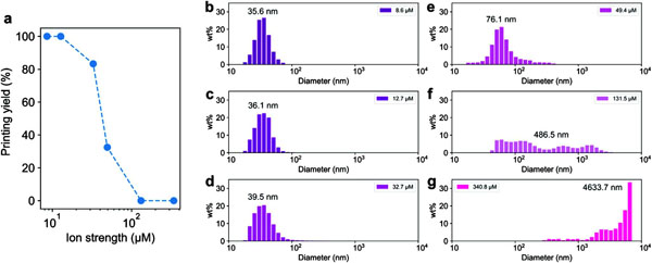 b-g)不同离子强度下纳米金刚石悬浮液的粒径分布,从(b) 8.6、(c) 12.7、(d) 32.7、(e) 49.4、(f) 131.5至(g) 340.8µm。随着离子强度的增加,由于大尺寸的纳米金刚石的聚集体堵塞喷嘴,导致打印产率下降。