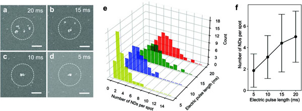 e)在20(红色)、15(绿色)、10(蓝色)、到5 (黄色)ms不同脉冲长度下,每个点打印的纳米金刚石数量分布直方图。