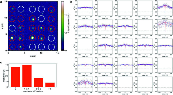 a) 5 × 5打印纳米金刚石阵列的共聚焦荧光图像。每个点都是用电压幅度为360 V、长度为5 ms的单个电脉冲打印的,使用的是1µg mL−1纳米金刚石油墨。红色圆圈表示可检测到NV自旋,而白色圆圈表示未检测到。