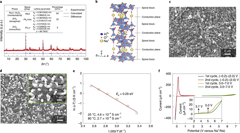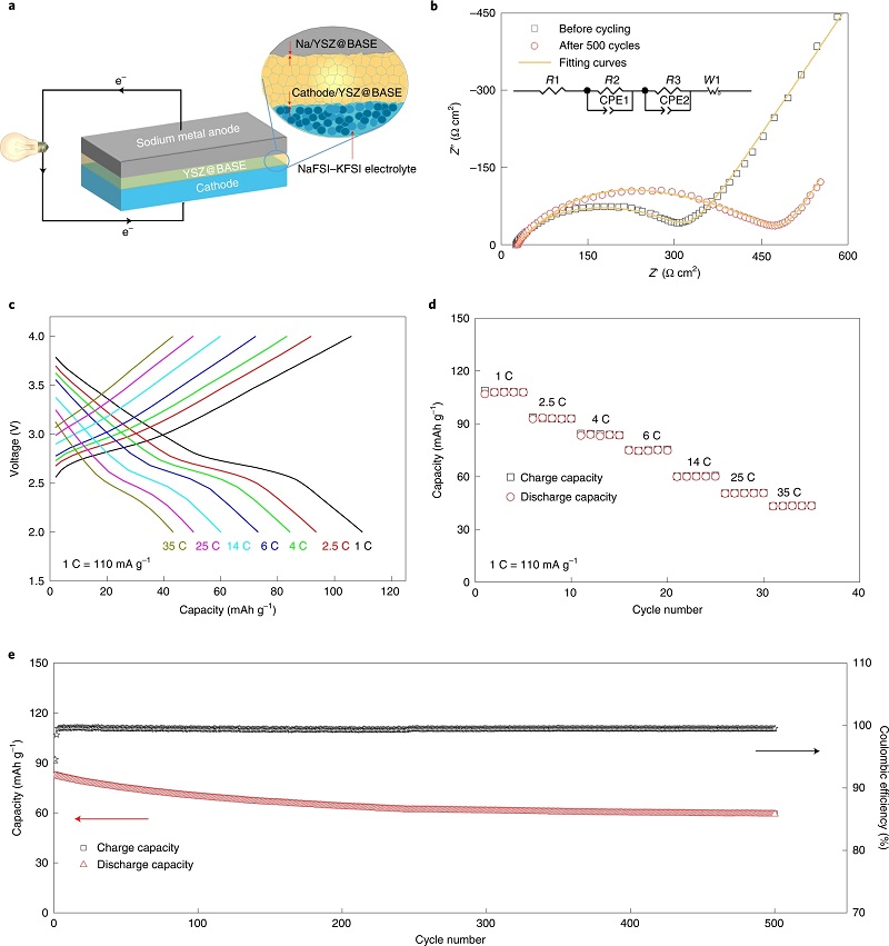 (a)具有Na负极、YSZ@BASE电解质、NaFSI-KFSI电解质和NaNCMT/炭黑/聚(二氟乙烯)复合正极的准固体电池示意图;