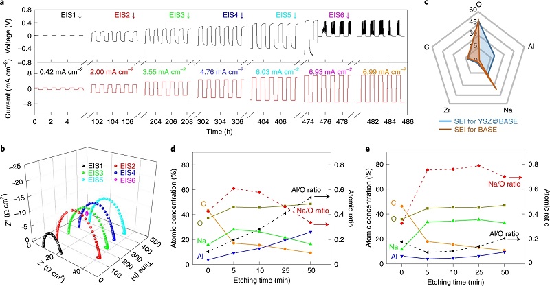 (d-e)BASE和YSZ@BASE的Na沉积/剥离机制示意图,以说明界面锚定效应和界面形成。