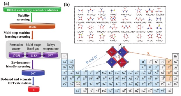 复旦大学Yiqiang Zhan和Hao Zhang等人在Adv. Sci.上发表了一篇题目为“Discovery of Lead-Free Perovskites for High-Performance Solar Cells via Machine Learning: Ultrabroadband Absorption, Low Radiative Combination, and Enhanced Thermal Conductivities”的文章。作者通过将高通量DFT计算与机器学习技术相结合,开发了一种多步骤材料筛选方案,以加速发现具有热稳定性高的高性能太阳能电池新型无铅HOIDPs。选择钙钛矿的稳定性、禁带宽度和德拜温度作为目标性能,逐步筛选化学空间。为了在全球范围内搜索可能的HOIDPs候选化合物,首先从元素周期表中基于32种有机阳离子的元素组合的完整化学空间中筛选出包含18038种电中性化合物的数据库。然后利用结构稳定的条件筛选出结构不稳定的候选材料。第三,针对多目标多阶段屏幕建立了高精度的机器学习模型,并分析了相关特征对学习目标的重要性。基于机器学习预测的结果,一些类似斜方的无铅HOIDPs候选材料脱颖而出,并选择基于Br和环境友好的候选光采集技术进行进一步的DFT验证。最后,在带隙合适、德拜温度较高的条件下,筛选出了4种具有较高热稳定性的无铅HOIDPs太阳能电池材料,分别是(CH3NH3)2AgAlBr6, (CH3NH3)2AgGaBr6, (CH3NH3)2AglnABr6和(CH2NH6)2AglnBr6)。