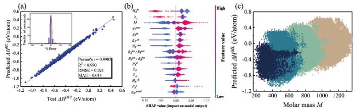 a) 测试组中每个原子的实际形成能△HDFT和预测的每个原子形成能△HML。通过计算皮尔逊系数(r)、决定系数(R2)、均方误差(MSE)和平均绝对误差(MAE)来估计预测误差。红线表示的理想线表示理想预测结果,黑线表示的拟合线表示实际预测结果。这两条线基本重合。图中所示为预测的△HML和△HDFT的误差百分数。红色曲线显示了趋势。