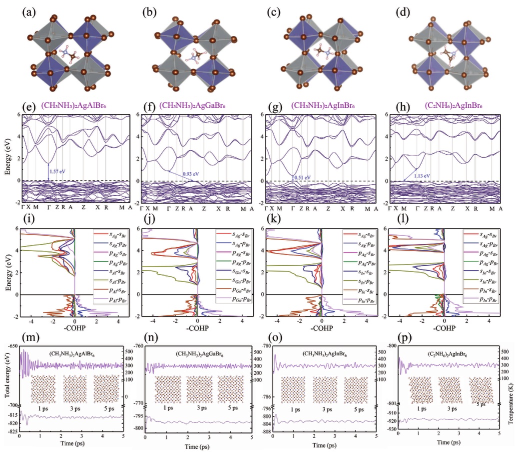 m-p) 室温下5 ps AIMD模拟过程中。筛选的四种HOIDPs ((CH3NH3)2AgAlBr6, (CH3NH3)2AgGaBr6, (CH3NH3)2AglnABr6和(CH2NH6)2AglnBr6)总能量和晶体结构的变化。