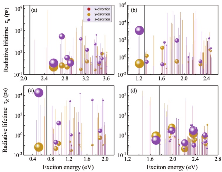 图6 选定HOIDPs多体相互作用诱导的激子寿命。灰线为QP带隙,圆半径表示激子对激子吸收峰的贡献